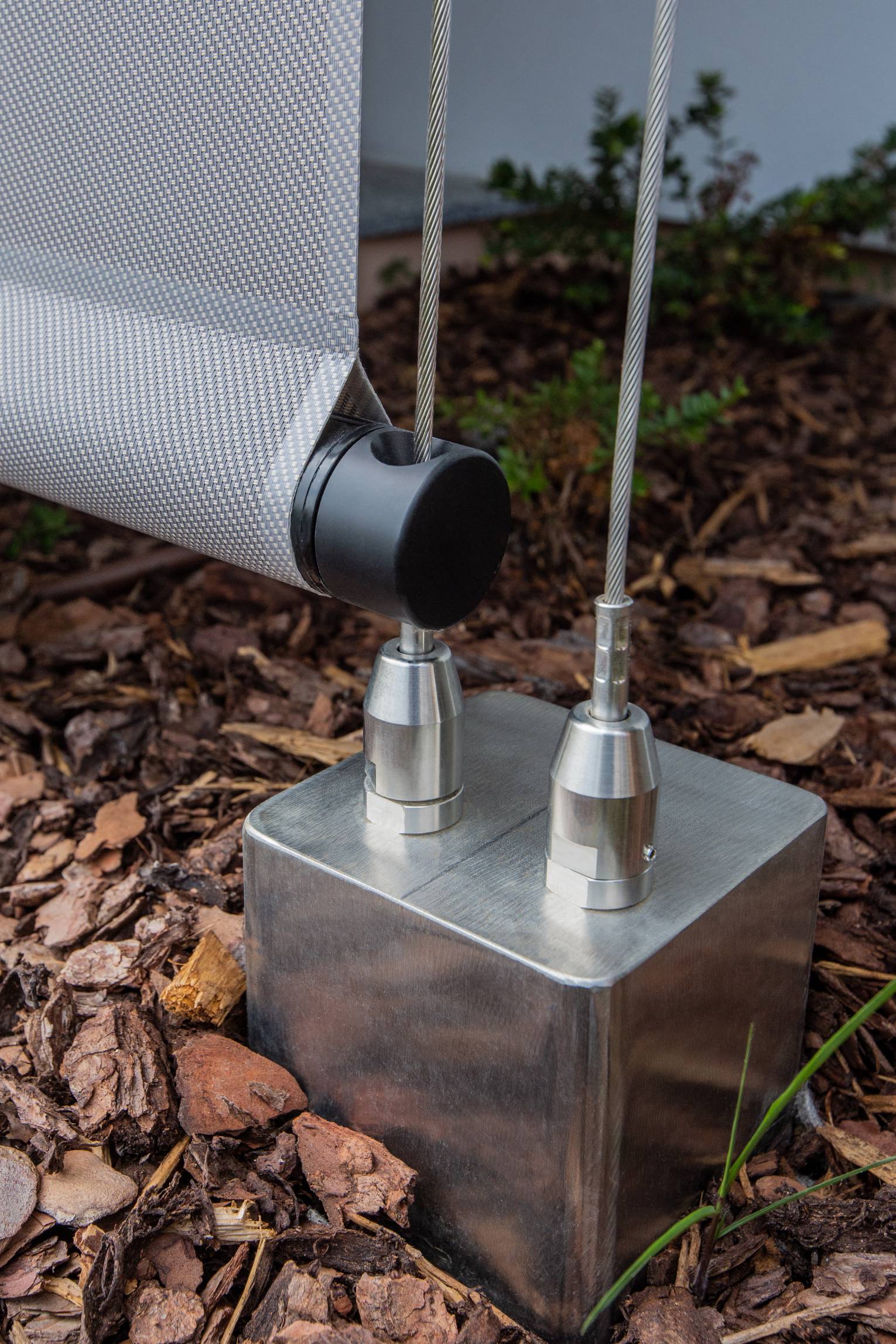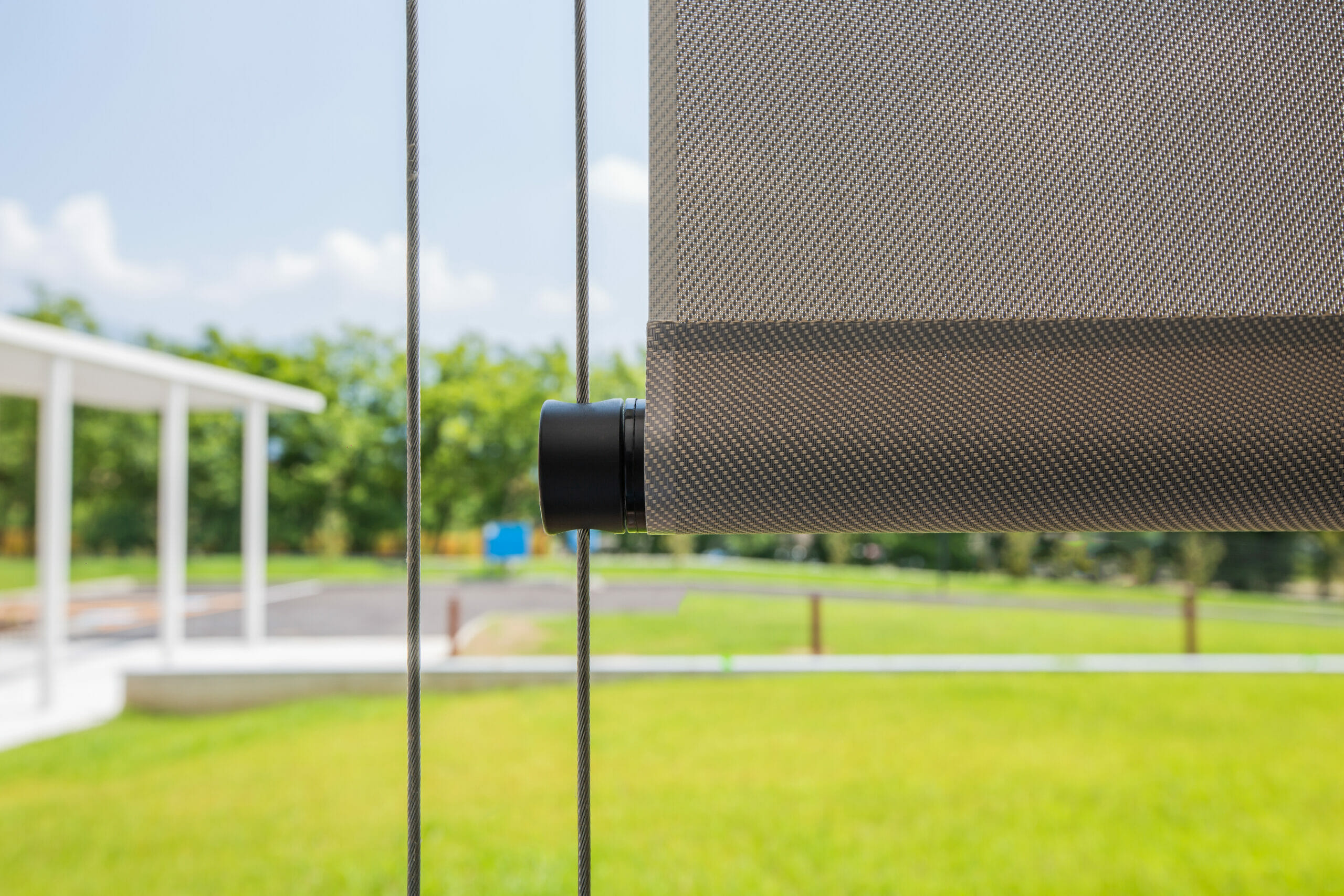 À l’extérieur, ce sont 35 SYSTÈMES DE STORES ROULANTS MOTORISÉS, MODÈLE RESS FLEX 01, caractérisés par des guides-câbles en acier inoxydable de 4 mm avec fixation supérieure au plafond et fixation inférieure au sol, qui ont été installés. Pour le tissu, totalement ignifuge et sans toxicité, le SUNSCREEN SATINÉ 5500 de couleur gris/sable a été choisi – code 30110, composé de 42 % de fibre de verre et 58 % de PVC. Avec un facteur d’ouverture de 4 %, il garantit une résistance efficace à la lumière et une protection contre les rayons UV de 96 %. De plus, le choix de la couleur foncée du tissu permet de retenir la chaleur, améliorant ainsi les performances énergétiques de la structure.