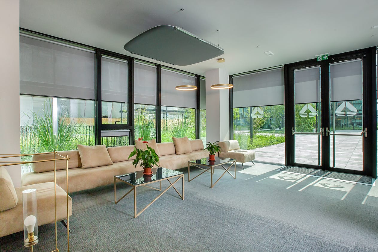 Le tissu choisi pour l’ensemble des protections solaires conçues et installées sur les vitres est le tissu filtrant SILKSHADE ALU de couleur gris clair, composé à 100 % de polyester ignifuge et SANS PVC. Concrètement, sa structure linéaire donne aux pièces une touche d’élégance minimale et intemporelle grâce à la brillance du tissu qui rappelle la soie. Son facteur d’ouverture de 3 % permet de conserver une visibilité extérieure confortable et garantit un effet antireflet efficace et par conséquent, un excellent confort visuel pour mieux profiter des espaces de travail. De plus, étant un tissu avec un dos aluminisé, il reflète efficacement les rayons du soleil, assurant une température confortable même en été.