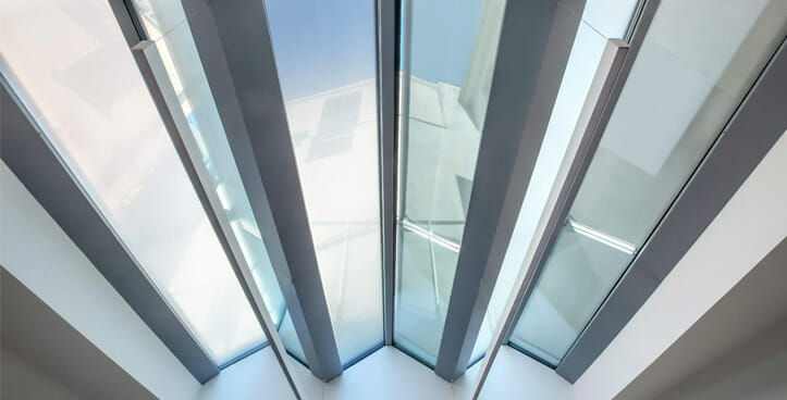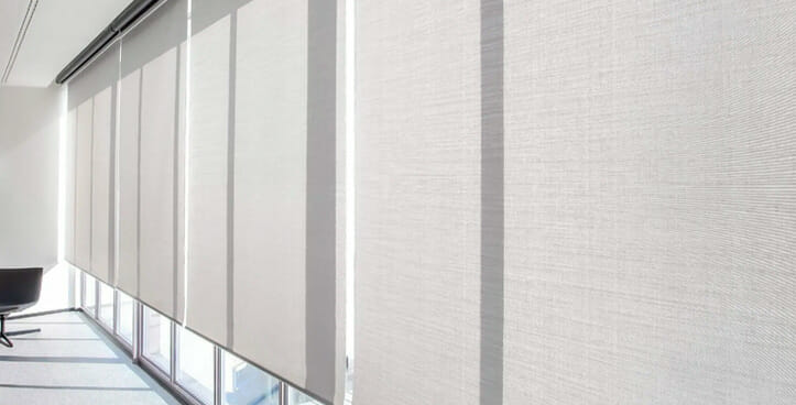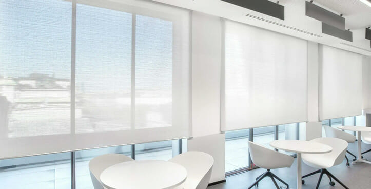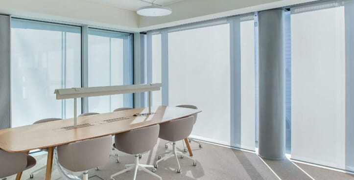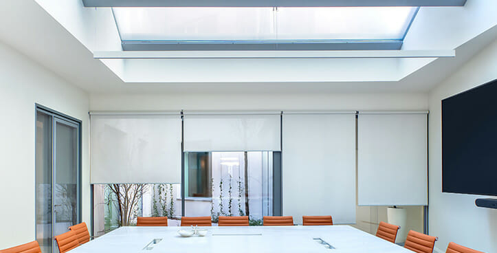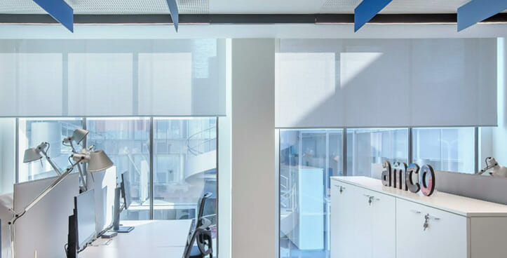 Enfin, dans la rue Porlezza 8, 6 stores équipés du TRACTION KIT 55 sans coffre, entièrement sur mesure, ont été créés pour le revêtement extérieur incliné de la lucarne en verre de l’élégante salle de réunion située au rez-de-chaussée du bâtiment. Grâce au tissu SUNSCREEN SATINÉ 5500, blanc perlé – code 30027, l’espace est donc confortable, garantissant une gestion efficace de l’éclairage naturel. Au rez-de-chaussée, nous trouvons le système de volet roulant F110, motorisé et fixé au plafond. Dans ce cas également, le tissu choisi est SOLTIS TOUCH Blanc Carrare – code. 53937 Au lieu de cela, pour les autres espaces de travail des étages supérieurs, le modèle de volet roulant F 102 à chaîne a été installé pour les fenêtres avec tissu E-SCREEN Gris Perle – code 30328, et le modèle F 114 motorisé pour les portes, toujours combiné avec le tissu E-SCREEN mais dans la version Blanc – code 30328